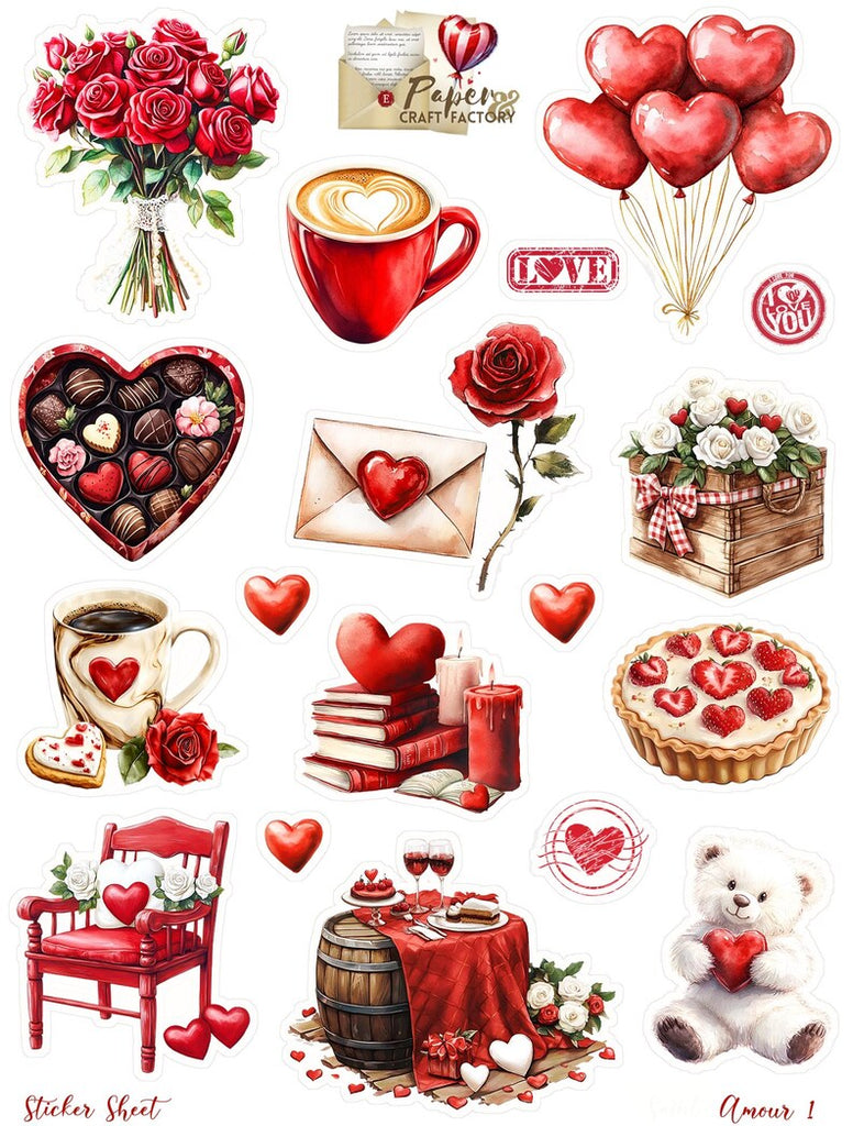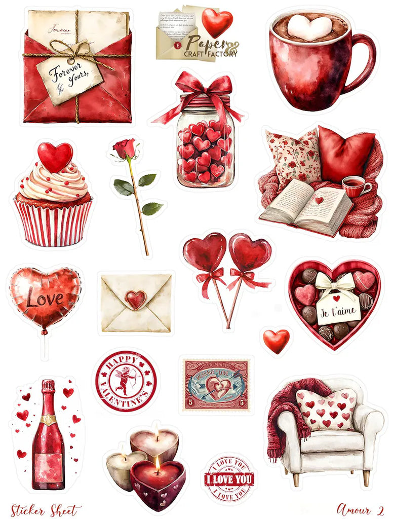 Planches de stickers autocollants sur le thème de l'amour, de la saint valentin, une planche de jolis timbres complète le lot.